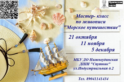 В рамках реализации федерального проекта «Пушкинская карта» Нижнеудинская детская школа искусств «Спутник» приглашает на Мастер- класс по живописи «Морское путешествие»: 21 октября 16:00 11 ноября 16:00 5 декабря 16:00 по адресу ул.Индустриальная д.2. Телефон для справок 8-904-114-14-34. https://vmuzey.com/event/master-klass-po-zhivopisi-morskoe-puteshestvie
