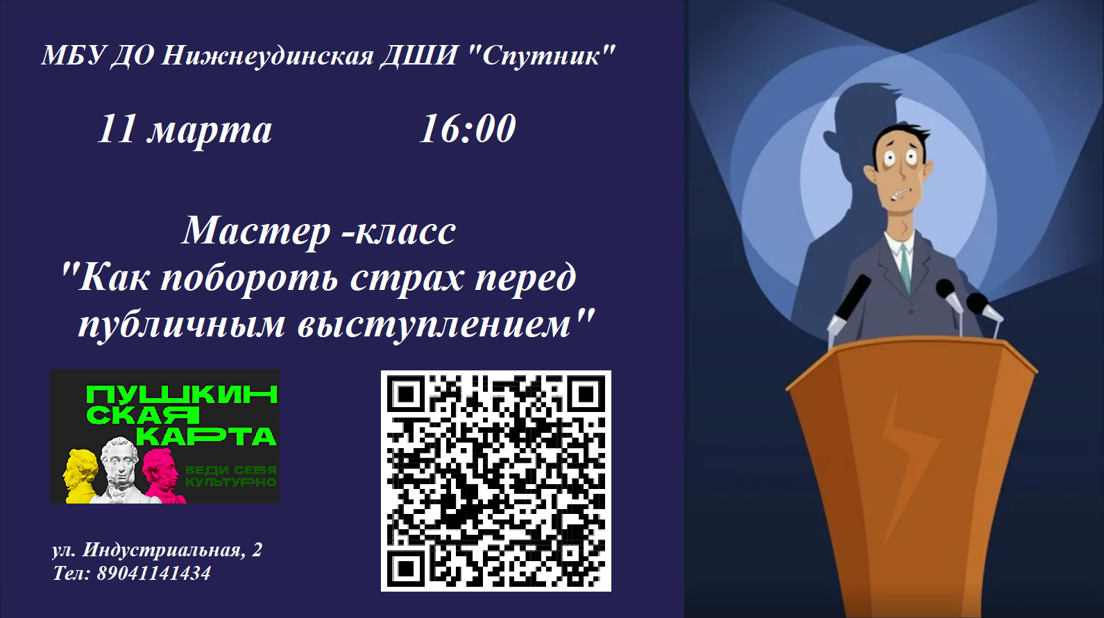 В рамках реализации федерального проекта «Пушкинская карта» Нижнеудинская детская школа искусств «Спутник» приглашает на Мастер- класс «Как побороть страх перед публичным выступлением».